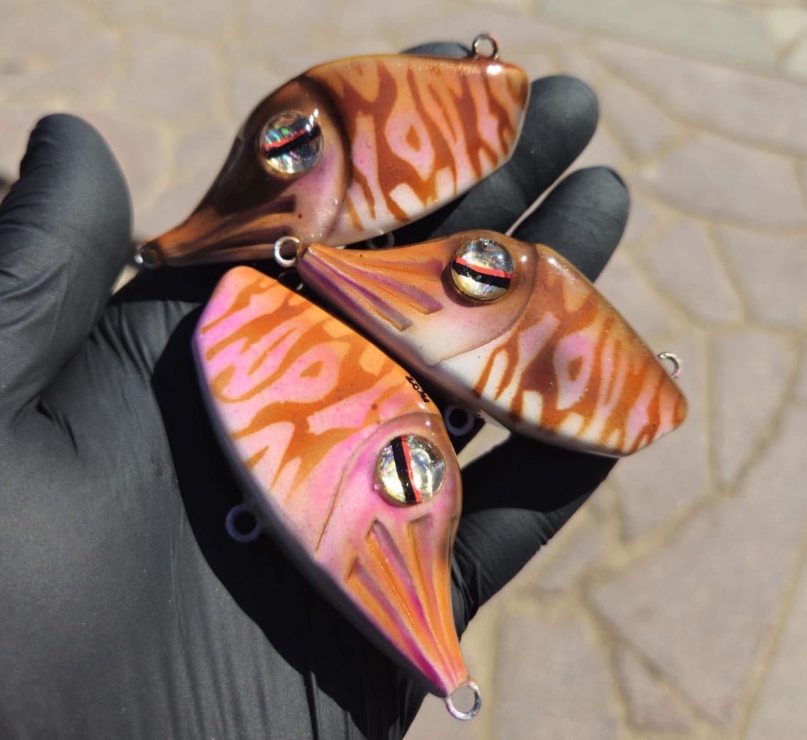 Σουπιά: H βαφή με χειροποίητα stencils ενός αμιγώς χειροποίητου τεχνητού πήγε παραπέρα. Τα ματάκια είναι custom με glass domes ώστε να είναι τονισμένα και να εξέχουν. Χρησιμοποιήθηκαν φωτοχρωμικές βαφές οι οποίες αλλάζουν στο φως και κάνουν τη σουπιά από λευκή – μώβ, όπως κάνει και το πραγματικό κεφαλόποδο όταν «φοβάται» ή αντιδράει σε κάποιο ερέθισμα όπως ένα ψάρι που το κυνηγάει. Η κοιλίτσα βάφτηκε με μπλε που φωσφορίζει στο σκοτάδι – λευκή σε συνθήκες φωτός. Οι σουπιές είναι πλάσματα που αλλάζουν χρώματα με μεγάλη ευκολία και το τεχνητό αυτό τις μιμείται. Οι ψαρευτικές ευκαιρίες και εφαρμογές είναι πολλές και εδώ μπαίνει η μαεστρία και η φαντασία όσων τις χρησιμοποιούν. Όταν έχουμε νύχτα, σούρουπο, ξημέρωμα, όταν εκμεταλλευόμαστε δομές όπως μονόπετρα στη θάλασσα, σκιές, φύκια. Σκεφτείτε μια μικρή σουπιά που έχει πέσει σε μια σκιά στα ρηχα. Κρύβεται ανάμεσα στις πέτρες. Και στα πρώτα μέτρα της ανάκτησης όταν την χτυπήσει το φως, αλλάζει χρώμα σαν τρομαγμένη…Και αυτό είναι μια από τις πολλές ιδέες. Kλασσική, μέτρια προς αργή ανάκτηση, μερικά twitches και αφήστε το τεχνητό να κάνει τη δουλειά του.
